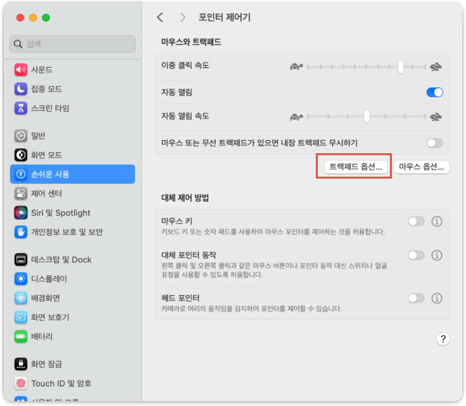 - 활성화 하기 : 시스템 설정 > 손쉬운 사용 > 포인터 제어기 (또는 마우스와 트랙패드) > 트랙패드 옵션 >> (1) 드래그에 트팩패드 사용하기 활성화, (2) 세 손가락으로 드래그 하기 선택.