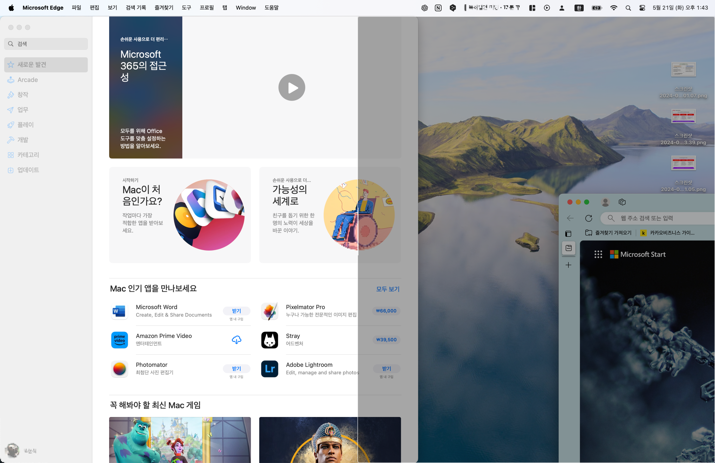 '핫 코너(Hot Corners)' 기능을 활용하면, 화면의 특정 모서리로 마우스를 이동시켜 미션 컨트롤을 활성화하거나 스크린세이버를 시작하는 등의 작업을 수행할 수 있습니다. 이는 작업 전환 속도를 높이는 데 유용합니다. 또한, '스플릿 뷰(Split View)'를 사용하면 두 개의 애플리케이션을 화면에 나란히 배치하여 동시에 작업할 수 있습니다. 이는 비교, 복사, 붙여넣기 등의 작업을 할 때 매우 효과적입니다. 창을 선택하고 왼쪽 혹은 오른쪽 화면 경계에 드래그하면 아래 이미지와 같이 스플릿 뷰 옵션이 나오게 되고, 선택을 해제하면 바로 창 분할이 적용됩니다.